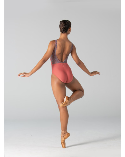 This Arletty dance leotard from WearMoi features wide straps and a neckline edge embellished with lace-like flocked fabric. The beautiful back details offer extra support and help conceal a nude support bra if needed. The open lower back creates an unforgettable look on this one-of-a-kind dance leotard. Fully lined.